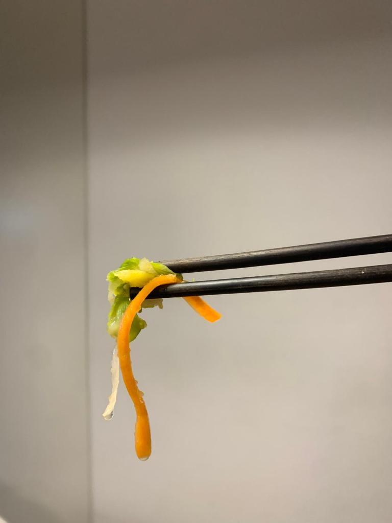 Per prima cosa prendete il cavolo e tagliatelo in quarti, poi lavatelo accuratamente e cospargete ogni quarto con del sale fino. Lasciatelo macerare per circa 1 ora e sciacquatelo sotto l’acqua corrente per rimuovere il sale in eccesso. Unite in un contenitore il cavolo, le carote e il cipollotto tagliati a listarelle.