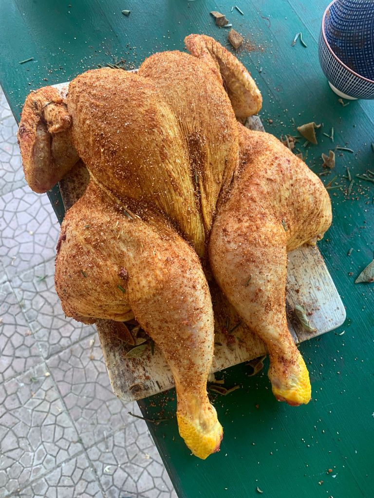 Con una fiamma ossidrica, poi, fiammeggiate la pelle eliminando i peli. Rimuovete anche il grasso in eccesso e le punte delle ali. Adesso dedichiamoci al rub: in una ciotola unite tutte le spezie e aromi (nelle dosi che preferite). Cospargete poi il pollo con il mix di spezie e l’olio e massaggiate in modo da far aderire il condimento alla pelle.